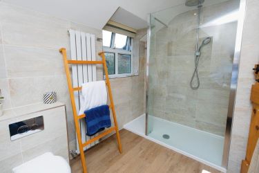 A modern suite and stylish comprising wall in shower cubical with power shower and ceiling attached drenched shower attachment, enclosed cistern WC and vanity wash hand basin with cupboards under. Tiled walls, wood laminate floor, stylish vertical panel radiator, obscure PVC double glazed window to the rear garden