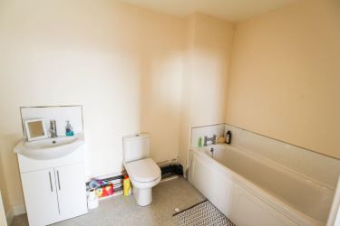 En-Suite Bathroom - Fitted with a three piece suite comprising a low level flush w/c, large oval wash hand basin set in a vanity unit, and a bath with a shower and glazed screen over. Tiled walls and floor, spotlighting.