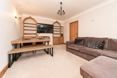 A bright living room with windows to side and rear and plenty of living space. Twin recessed shelving with matching storage cabinets and wood store.