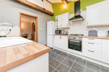 A good size kitchen/breakfast room with tiled flooring and range of units comprising; sink unit with storage cupboard under, range of fitted work surfaces with storage cupboard and space below, matching wall mounted cabinets and wine rack. Inset 4 burner gas hob with built-in oven and extractor over. Windows to side and rear aspect with door to outside and access to: