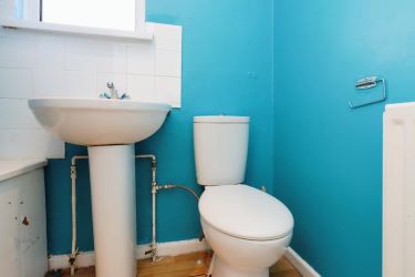 Having suite comprising enamel surfaced bath, pedestal wash hand basin and low level flush W.C. Panelled radiator and UPVC framed patterned single glazed window
