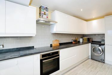 Double glazed window to the front aspect, range of matching wall and base units, roll top work surface, integrated induction hob and electric oven, with stainless steel extractor fan over, integrated dishwasher, plumbing for washing machine, space for fridge freezer, black granite one and a half bowl sink and drainer with hot tap, vinyl flooring