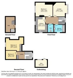 The accommodation comprises a private front door at ground floor level, stairs to the first floor landing. lounge, bedroom, fitted kitchen diner, bathroom and a W.C. and stairs to the second floor with two further bedrooms. Outside there are gardens to the front, side and rear with a home office located in the back garden as well as off road parking.
