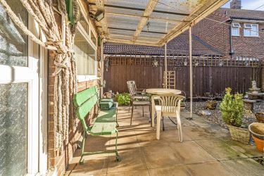 Low maintenance rear garden enclosed with wooden fencing, two outhouses with power and lighting, passageway leading to front of property.
