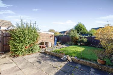 The rear garden has a good size patio area, lawn and some plants shrubs and bushes.