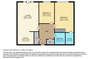 The internal layout consists of a squared central hall, to one side a large open plan kitchen/living area. There is a master bedroom with fitted wardrobes and an en-suite shower room, plus a generous second bedroom, separate bathroom, and two large storage cupboards.