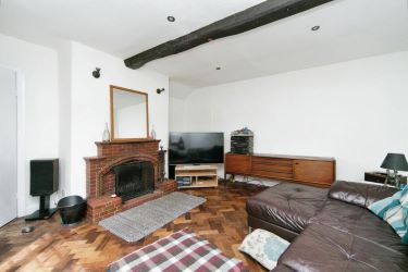 Parquet wood floor, PVC double glazed window to front aspect, open fire with exposed brick feature back piece, mantle and hearth, solid oak ceiling beams, under stairs storage cupboard, wall mounted radiator, door to kitchen