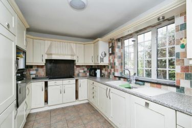 A range of wall, drawer and base units, worktop with inset 1.5 bowl composite sink units, electric hob with extractor hood over, separate eye level oven, integrated dishwasher, tiled splash-backs, wall mounted radiator, PVC double glazed door to the rear garden, door to utility