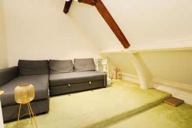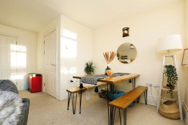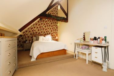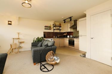 This lovely bright and airy apartment offers an ideal first time buy or investment property with lots of character and offers contemporary living on two levels. The property is accessed via the rear of the building directly into the grand foyer. The living space comprises entrance hallway, open plan living/kitchen fitted with a range of base and eye level units in neutral tones, with subway tile splashback, open shelving and integrated appliances, and a modern family bathroom also located on the hall floor. There are two double bedrooms located on the first floor, both unique in style and character with vaulted ceilings, feature wood beams and Velux windows letting in lots of light, with plenty of room for storage, as well as a large built-in storage cupboard to the first floor landing.