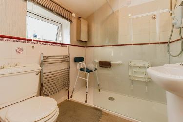 The bathroom offers a large walk in shower together with a WC and hand wash basin.